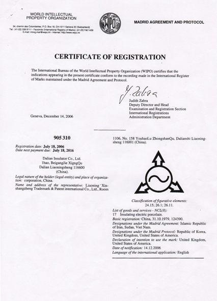 荣誉客户案例展示:电瓷集团马德里国际注册证
