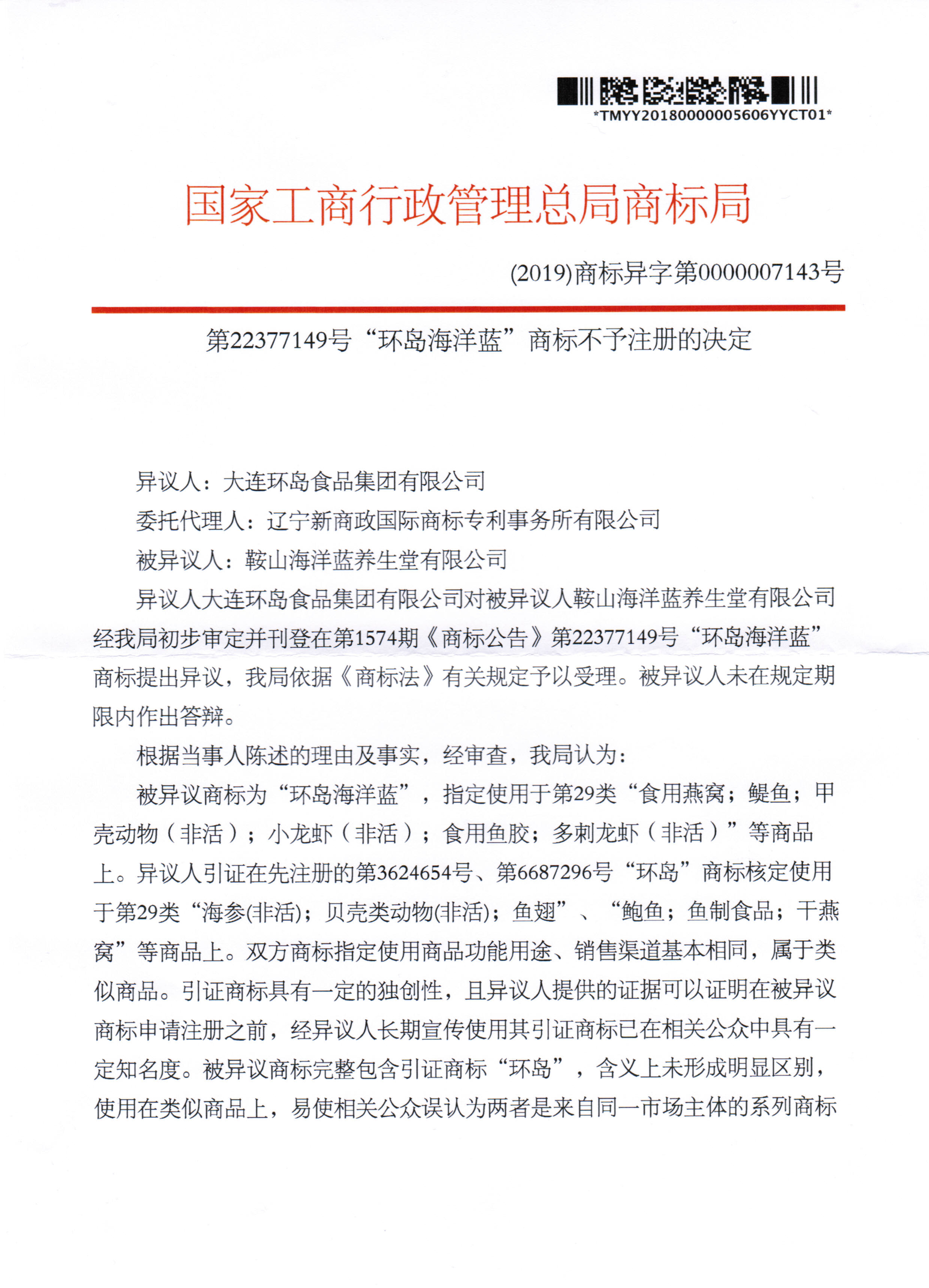 新商政代理环岛集团“环岛海洋蓝”商标异议申请案获胜
