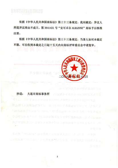 申请人采用了我司的建议,在异议答辩期限内委托我司进行了商标异议答辩。2009年12月23日商标局下达了(2009)商标异字第23321号《“安可卓尔ALKAZONE”商标异议裁定书》,商标局裁定“经审理,我局认为:异议人称被异议人完全知晓‘ALKAZONE’商标是异议人独创并使用的商标,被异议人抄袭及抢注其‘ALKAZONE’驰名商标证据不足。……我局裁定:异议人所提异议理由不成立,第3641431号‘安可卓尔ALKAZONE’商标予以核准注册”。至此,申请人赵仁顺(大连安可来福生物产品销售有限公司)最终获得了“安可卓尔ALKAZONE”商标的注册成功。