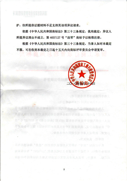 申请人采用了我司的建议,在异议答辩期限内未进行了商标异议答辩。2010年05月26日商标局下达了(2010)商标异字第10261号《“浪琴”商标异议裁定书》,商标局裁定“经审理,我局认为:被异议商标‘浪琴’与异议人引证的在先注册的‘浪琴’商标使用商品和服务不类似,与引证于类似服务上在先注册的‘LONGINES’等商标未构成类似。本案中,异议人请求认定其引证商标为驰名商标并给予特殊保护,但所提供证据材料不足支持其该项异议请求。……我局裁定:异议人所提异议理由不成立,第4037127号‘浪琴’商标予以核准注册”。至此,申请人丛爱琴(大连浪琴酒楼)最终获得了“浪琴”商标的注册成功。