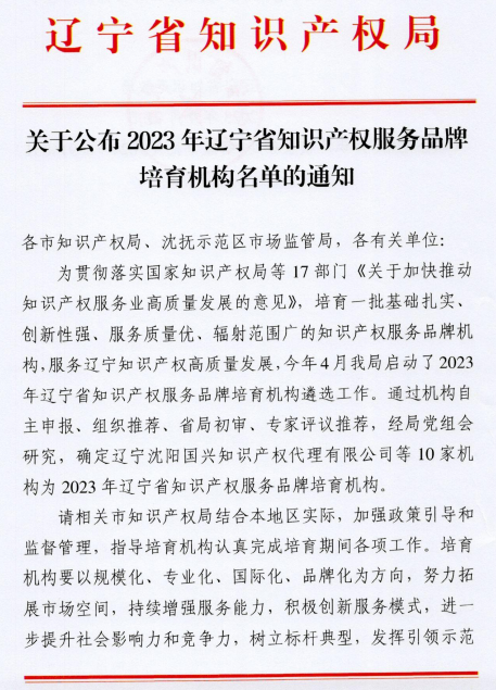 近日根据辽宁知识产权局发布的通知,我所经过层层评比喜获2023年辽宁省知识产权服务品牌培育机构称号,这是继2024年8月我所获得大连市知识产权服务机构A级称号后的又一殊荣,感谢省市领导对于我所工作的肯定,也感谢广大客户朋友给予的好评,我们将继续努力,严于律己,再创辉煌。